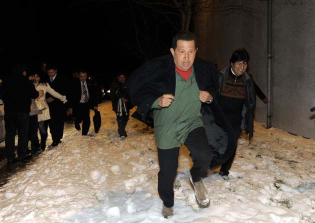 diciembre 18, 2009Esta foto de Hugo Chavez fue tomada anoche en Copenhagen y en ella se le ve correr para alejarse del olor de azufre despues que Obama hablo en la Conferencia, aunque otros sugirieron el se alejaba de un Holandes volador de esos que quieren invadir Venezuela.